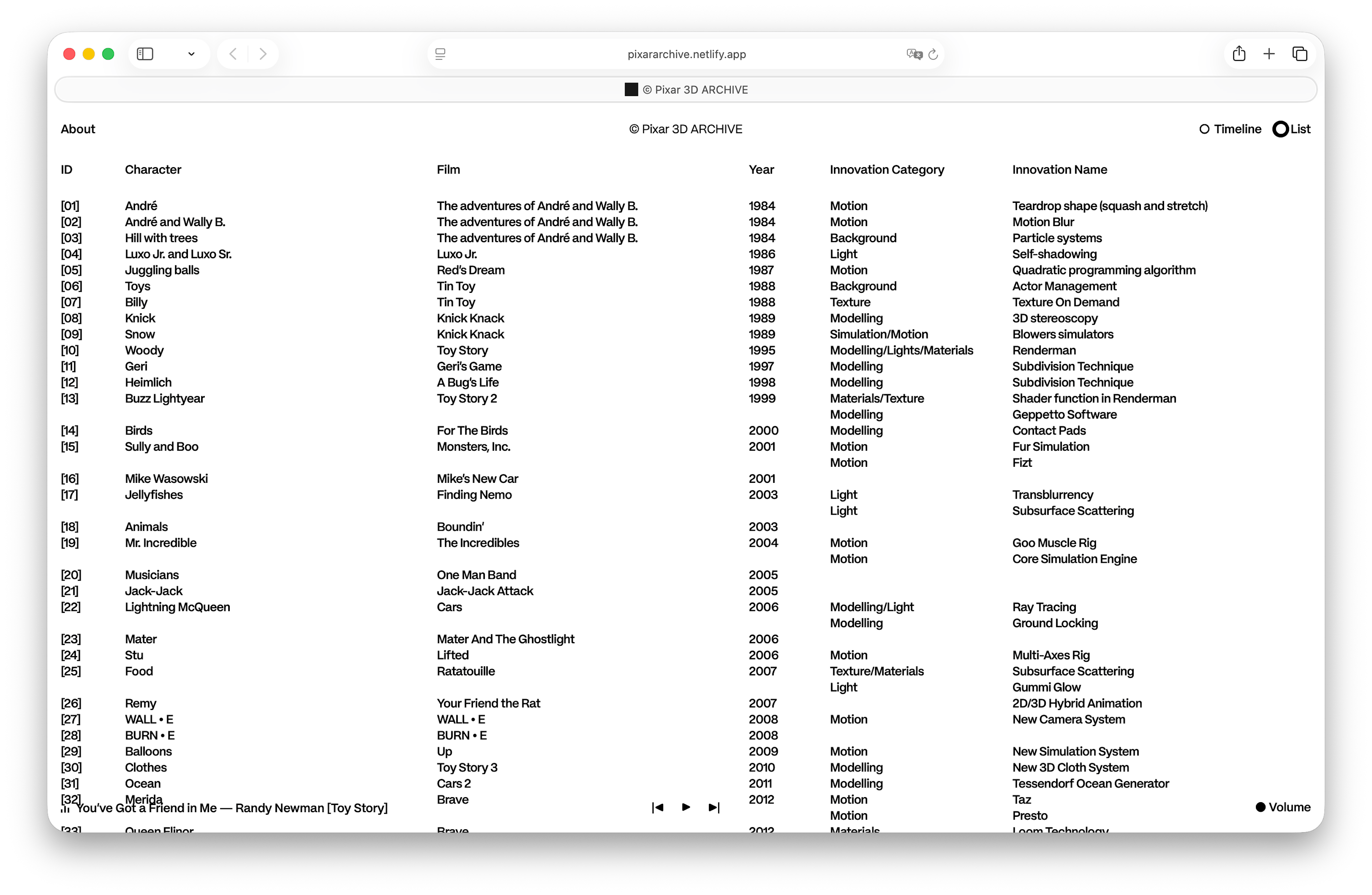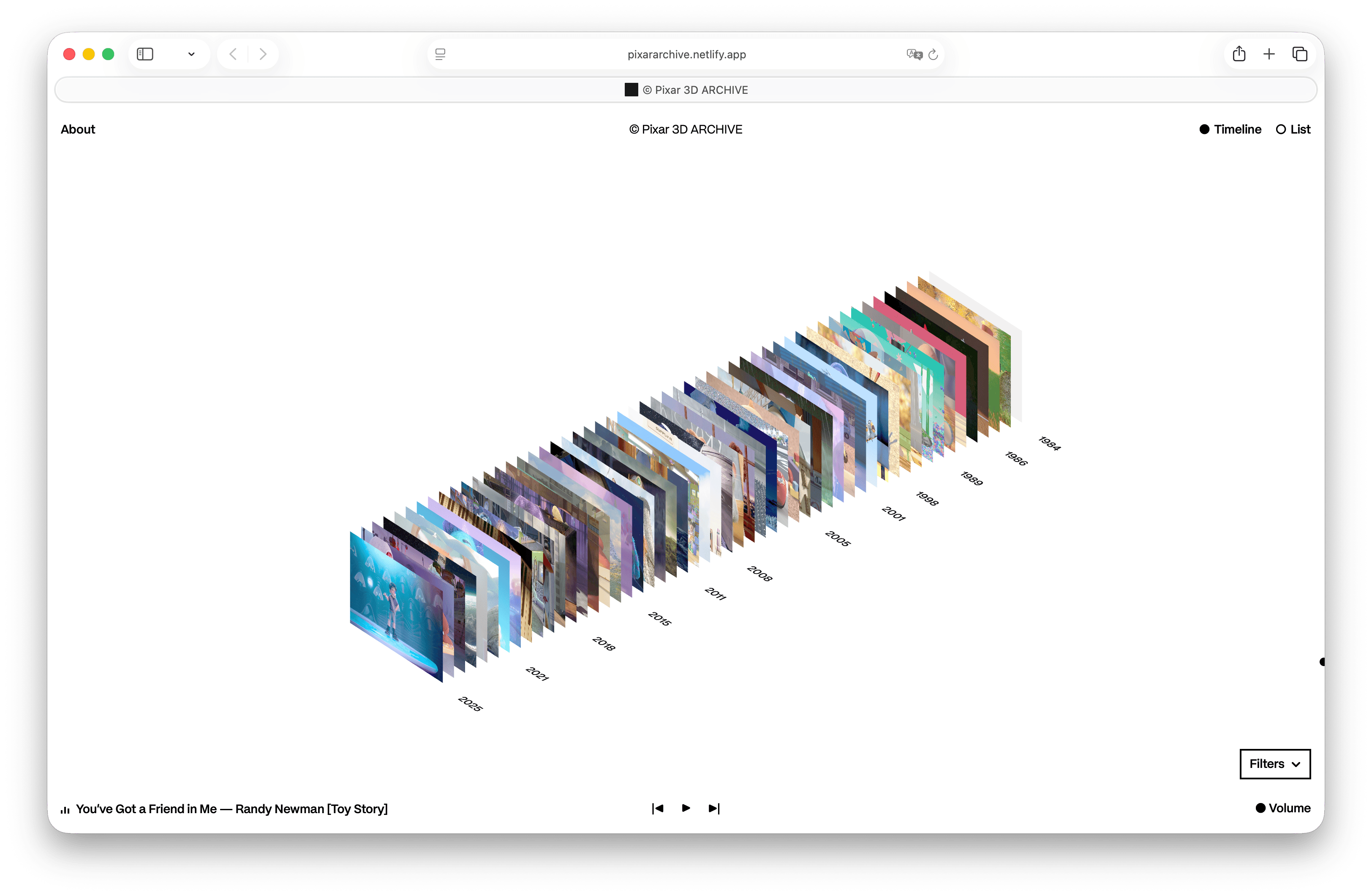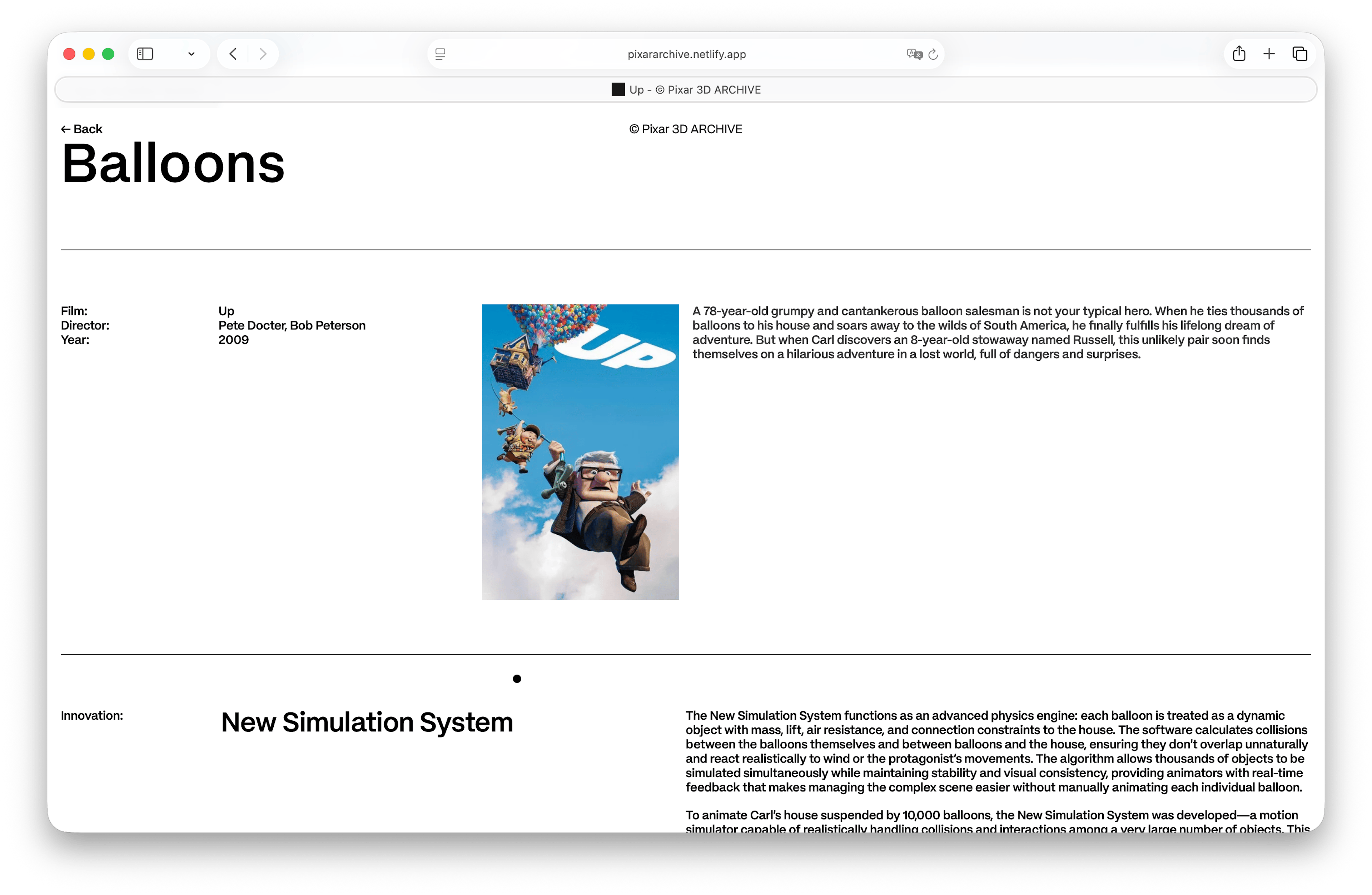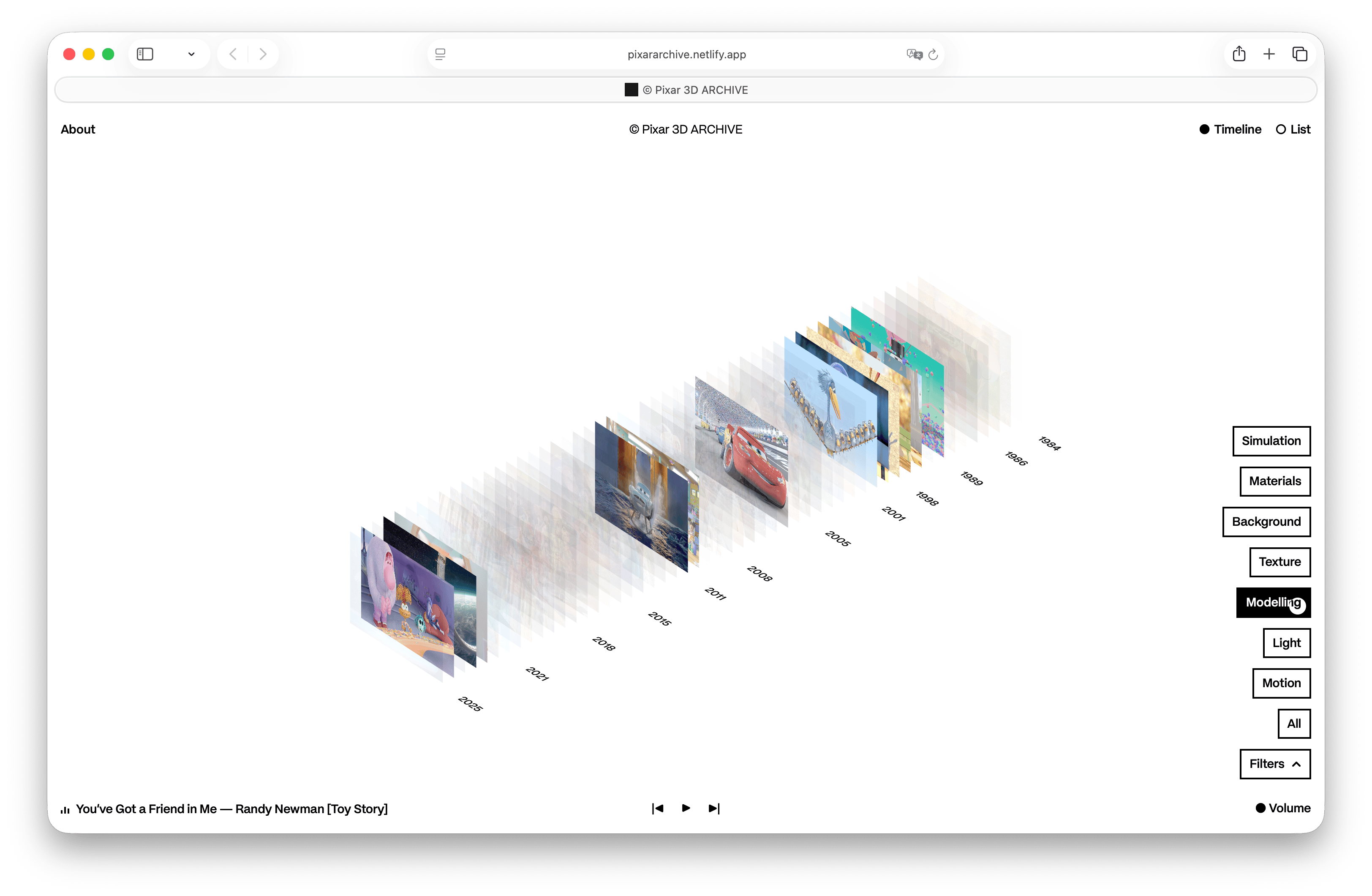Pixar 3D ARCHIVE is a web platform conceived as a space where users can explore the complexity of Pixar’s archive through the technologies developed by the studio over time. The website transforms a dense technical archive into an accessible visual experience, allowing visitors to understand how innovation evolves across different films.